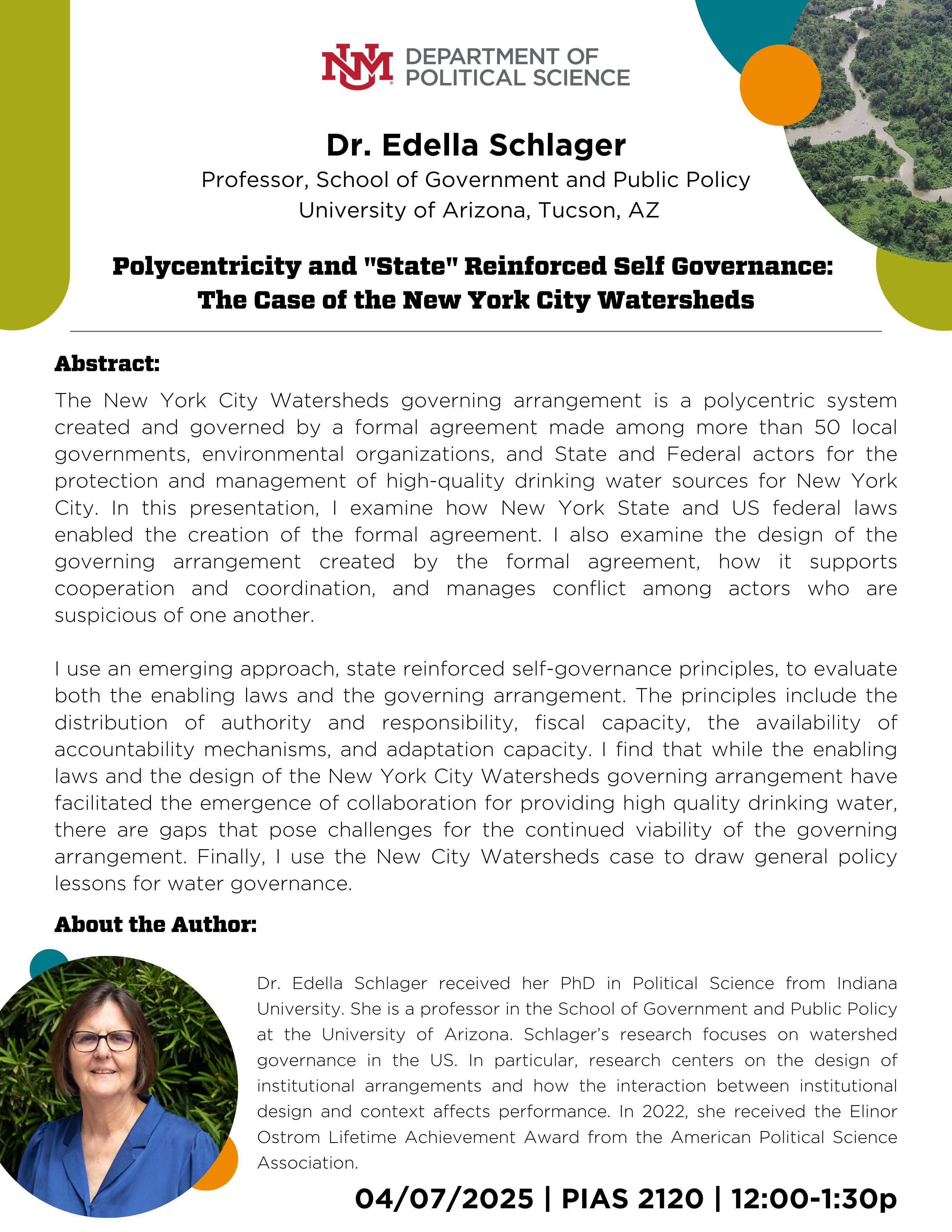 Please join the Department of Political Science as we welcome, Dr. Edella Schlager, Professor in the School of Government and Public Policy at the University of Arizona in Tucson, AZ. This event is free and open to the public. Talk title and abstract are below.